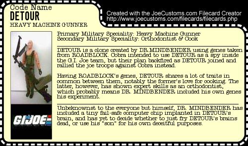 I was playing with a spare Double Blast (or Roadblock, as I often mistake it) figure of mine when its whole right arm broke off, and the figure was instantly put on my customizer parts. I tried to unscrew the torso but the screw was stuck, and I couldn't separate his parts, so I decided to customize it as is.
