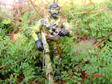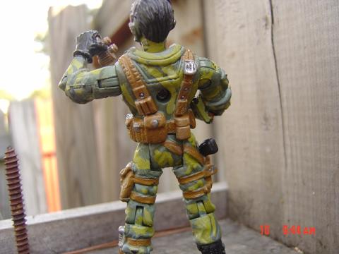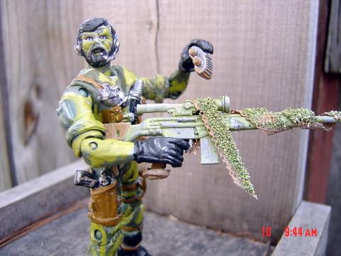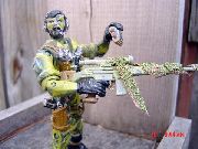 I wanted to make him with facial hair to give him and extended stay in the jungle look. On the file I used copper mesh and glue on some green frock. I had to paint him twice because the sealer I used turn alot of it gray. This is only my first version of Crosshair I plan on a few more. Prone, ghilie suit, etc.etc.