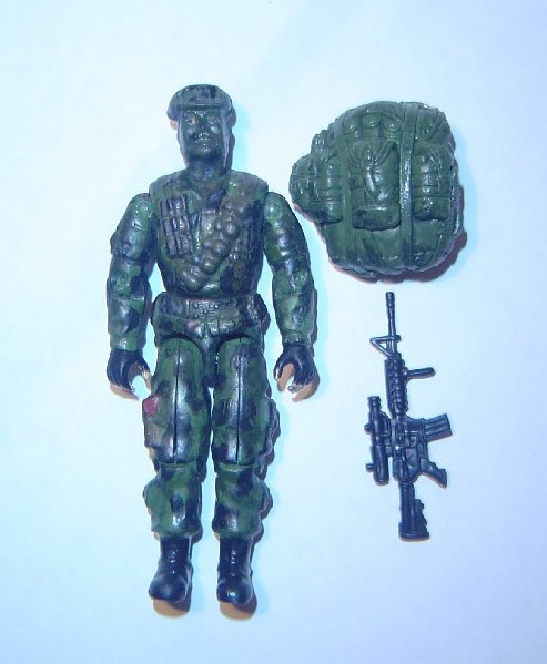 This is my first custom paint job. I am very pleased with the outcome of the camo pattern and the look of the figure. The first thing I learned doing this, don't overdo the layers of paint!!! Somewhere during the process, I stripped the layers of paint with a tooth brush and started from scratch. I also broke the peg in the right knee joint.