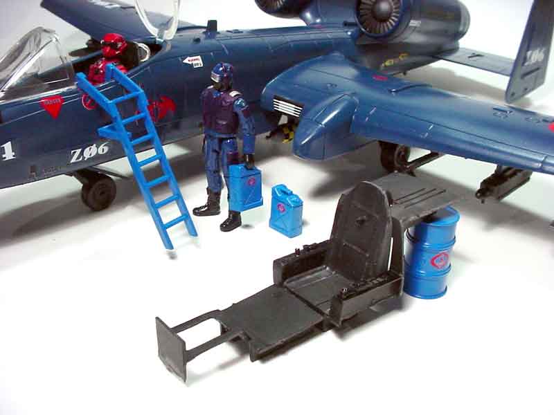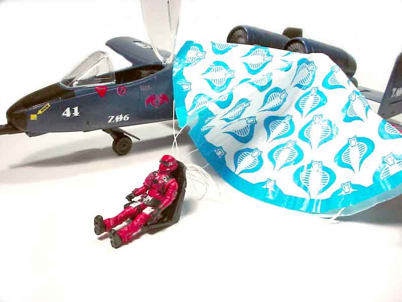 I've seen several of these A-10s floating around in internet land customized like the famed Rattler. As far as painting goes, there's nothing too special here. I did, however, address a common issue in doing this custom: the cockpit. Anyone who owns one of these knows how Wild Weasel doesn't fit and requires cutting the seat to make him fit. I have created a cockpit that the only tools you need is a screwdriver to open up the plane. All you have to do is just drop in the new pieces and you're good to go! This also has a feature that the original Rattler didn't- a removable ejection seat! As you can see in one of the photos, I've attached one of the parachutes from the Funskool Wild Weasel figures. This A-10 is really a great value and fun and pretty easy to customize. I've got a couple more ideas for modification that I may do in the near future.