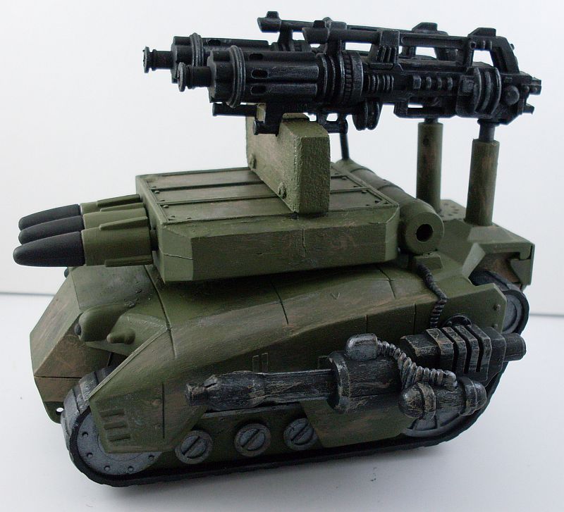 The Slammer AR-3 was one such Warbot. Designed primarily for destroying fortified bunkers, it sported a three-tube missile rack firing HEAP rounds capable of penetrating up to three feet of reinforced concrete; a flamer thrower mounted to one side and a 7.62mm internal-feed machine gun mounted to the other tended to make quick work of any survivors. The tracked, armored vehicle body gave it a high degree of mobility and it's low-slung profile made it a difficult target to hit.