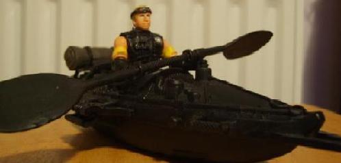 The original Beaver, Quickfire and Stakeout were pretty much identical figures. In striving to make this character different from Quickfire and Stakeout, I hit upon the idea of basing him on the GI Joe Tracker figure design, since they more or less serve the same purpose. The kayak was just sprayed black and then the bedroll highlighted in khaki. It's rather large for a silent attack kayak, but it'll do for now.