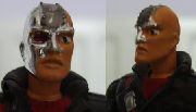 The original Red Jackal was a very sight repaint of Destro; although I used the updated Destro's head, waist and torso, I wanted to try something that would get away from the 'man in the silver mask' look. Taking my cue from that much-loved doyenne of the GI Joe range, Robo-Joe, I've tried to go for a partially cybernetic head, which is helped by the design of the V vs. V Destro. For the rest of the figure, I like the torso, as it suggests that 'Euro-terrorist' look that is very much part of the Red Shadows image. For the arms and legs, I found parts that once again suggested cybernetics, and was very pleased to put the arms of Swamp Rat (by far the worst GI Joe figure ever created) to some use at last.