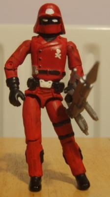 The original Red Laser drove the Laser Exterminator, a repaint of the HAL, and was a repaint himself, of Cobra Commander. I used the pieces of Cobra Commander that I liked, but with different waist and legs. Being in possession of a Cobra Commander helmet from Shipwreck, I wanted to 'unmask' the character, rather like I did with Red Vulture. The only problem was that I had no head that had a Japanese look, so I settled for hiding the actual face with a mask beneath a mask (rather like Cobra Commander in Devil's Due issue 25). I added a note to his bio to justify this new look.
