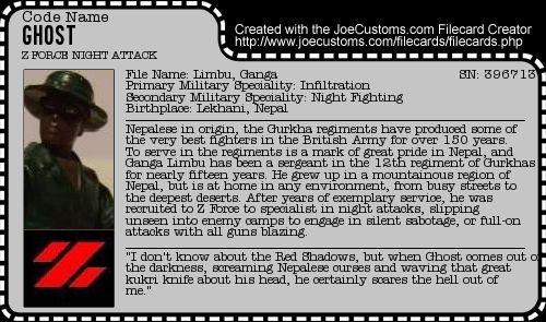 This figure is my only wholly original Action Force custom, and is my tribute to the Gurkhas, some of the best and most criminally under-valued soldiers in the British army. I had a spare Tunnel Rat head after I'd used his body for Tracker, and I just couldn't see a use for it, until I watched the film 'The Man Who Would Be King'. In that, the Gurkha sergeant, Billy Fish, is a hugely likeable character, and I got the idea of creating a Gurkha member of the team. I based the figure on the WWII Gurkha look, and was pleased to be able to find a use for the Alpine shorts in particular. Since a Gurkha wouldn't be a Gurkha without his kukri knife, I created one from the handle of a Roadblock knife and some loose card.
