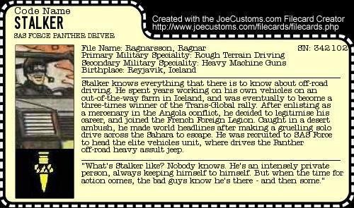 Stalker (no relation to the GI Joe ranger) was a slight repaint of the original Snake Eyes, and drove the Panther, a black version of the VAMP. I never much liked Snake Eyes, and the repaint wasn't really very much different from the original (a few bits of grey here and there; other, superior customisers have managed to make this work, but it's not for me), so I set out to recreate the figure from scratch, basing him on a picture in an issue of Battle Action Force. Using the (non-removable) goggles allowed me to get away with using the same head as Quickfire. Yes, I realise that this is a customising mortal sin. Sue me.