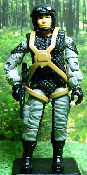 This guy has actually been something of an idea for me since I got back into the hobby in 2003. I had for some time his parachute pack--all wrapped up and just sitting there--but no figure to go with it. Then in 2006 I managed to get a pretty worn but mostly intact (only the crotch was broken, but not badly enough that I couldn't work around it) Crazylegs, and a few weeks back set down to redo him in a style I liked; out went the bright red (which screams "Shoot me!" if you ask me) which I replaced with black; I dulled down the shinier gray of his suit with a flatter version, then last but not least added the backpack and a replacement rifle. He now occupies my shelf of "original" Joes.