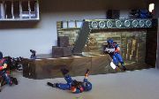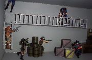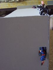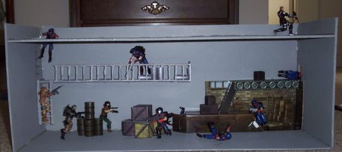 I wanted a ledge for snipers and so people could be pushed over. The box on the background opens for hiding. I used toothpicks on the railing to stabilize it. I liked how the Power Team HQ had a hatch to the roof, so I put that in for escapes. I figured the conveyor belt should lead to somewhere, so I put a hole there too. It makes for an entrance or exit.