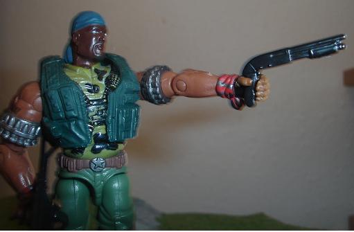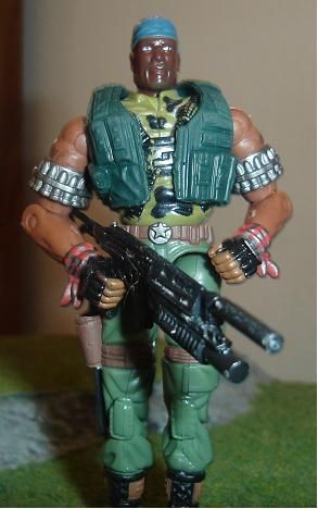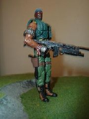 I wanted a large character figure similar to "Major Barrage" and I think Road Block was the perfect foundation. Throwing together a few spare figures and a Heavy Duty head made a pretty decent figure in my opinion. The gun was kit based as I had about 4 of those Galil rifles that came with Crankcase and a bunch of modular pieces from Marauder John. Plus, by clipping off the bottom of the holster on the thigh, I found that I could add a 12 gauge shotgun as a side arm rather then a pistol. I added the vest after thinking that he needed some place to put his tools
