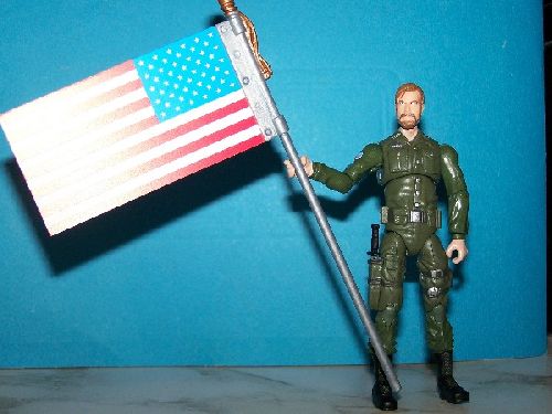 I really liked the look of the 3 Pack Hawk, but with the comic pack Hawk to represent his Colonel era and the upcoming single pack version to cover his General era I felt I could put this body to better use. Before I even got the figure I was thinking an Obi Wan head would make a great Joe Colton. This was a very simple custom to do. I had to use some plumber's tape to thicken up the neck post in order to make the head stay on and I left off the web gear. I think it's a pretty good representation of General Colton's appearance in the DD comics. I wasn't sure what to arm him with but I thought he looked pretty sweet toting old glory from the recent Jet Pack Duke. I also armed him with Snow Job's revolver.