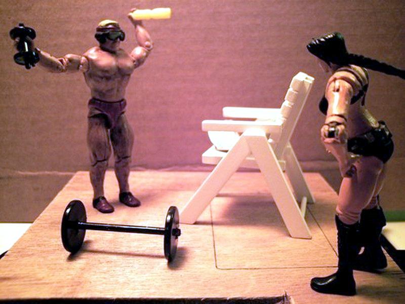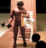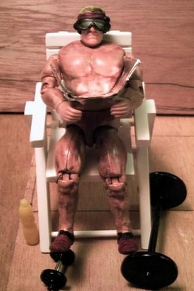 I had bought a v3 Major Bludd sometime back for the head. I always thought it was funny how he looked like he was wearing a purple leotard and red speedos. I decided to create a Venice Beach beachbum using the MB v3 waist. In order to create a more believable character, I grinded down Big Boa's lower legs so it looks as if he is wearing water shoes. Mirage's goggles were painted to look like sunglasses. Mirage's head was a no brainer for this guy. First off, his face is tanned as if from a spray tanner. Second, the blond crew cut is California all the way. Lastly, his head gear resembles stereo headphones and shades. The bikini clad lady giving him an attitude is one of the bikini biker babes I made a while back, I' ll put them up soon.