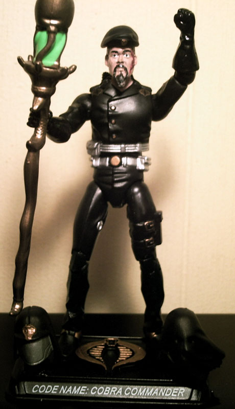 This is a total LBC, but it was just made for fun. I had the CC from the legions pack and was wondering what to do with it. After making Billy, I decided to make an unmasked version of the Commander. I gave Capt Sao Feng the hair club for men treatment and trimmed his vandyke. I repainted the head and colored the hair. All head gear fits um, well, just needs a little push ( unfortunately the helmet cut off CC's ponytail). I wanted a Cobra Commander that could be displayed with all of his headgear. I used v10 Destro's head because, WWCCD? {laughing maniacally}. This isn't the best unmasked but it's mine.
