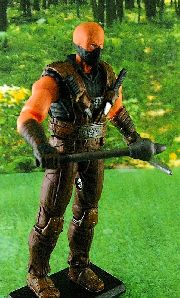 I built this guy last spring; he marked my first Thera custom to use (almost) entirely Joe parts and was created for a short "intro" story I was writing (still am, really.) The Swamp Rat face makes an ideally wicked-looking masked head, and the Gung-Ho body, with some paint (acrylic inks in this case) and modification, made for a suitable rough-looking bandit wear; the harness I had to cut and glue to the body to make it fit. The knifes were chosen for size and variation to show how bandits tend to pretty much pick up whatever weapons they use.