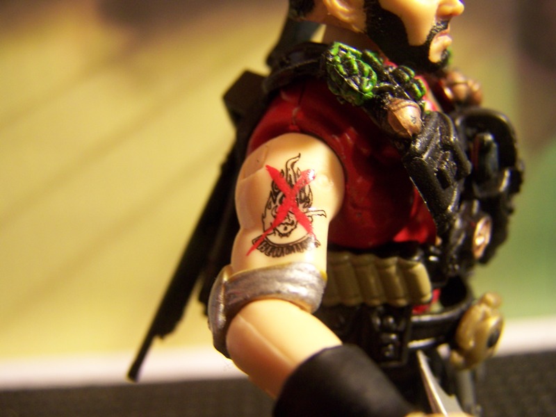He eventually joined a local gang and was given the name El Diablo, because it was said that when he fought he fought like the Devil. (Dirty) Diablo during a fight with a rival gang crossed paths with none other than Zartan who had been looking for some new talent to add to the Dreadnoks. Diablo liked what Zartan had to offer and joined the "Noks" and sealed the deal with a tattoo on his right shoulder. Diablo had finally mad it to the big time, no more, petty crime or turf wars. However after loosing several encounters with a Joe team known only as the Hunters (a group of Joe Bounty Hunters in my Joe verse watch for them) and having to retreat each time Diablo became unhappy with the Dreadnoks and wanted out. "I'm tired of being a looser I'd be better off with G.I. Joe". That didn't go well with Zartan at all, he immediately ordered Diablo terminated. Fortunately the Hunters found him before Zartan, Diablo asked to join the Joes and after some intense screening was sent to Sgt. Slaughter to become a part of the Renegades. Diablo never forgot the execution order from Zartan and is looking for some payback when the time comes.