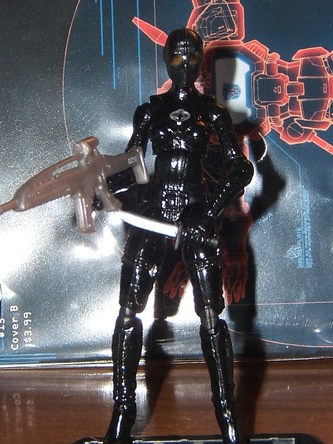 -RoC Assault on the Pit Baroness body, black paint to cover the silver parts of her outfit, and gold belt buckle. (Man I'm getting alot of use from that mold.)