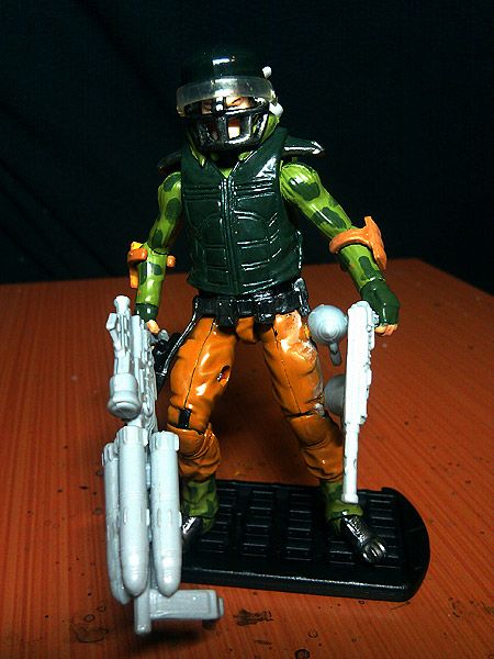 Never had the original figure or followed the DIC cartoon, but he was one of the more memorable ones from the few episodes I did manage to catch. Anyway, since he had tons of gear I figured it would be more practical to just buy the entire original figure off ebay. Anyway once I got a reasonably priced Grid-Iron in my hands it was game on :) His vest is yet another Sgt. Stone vest (quite a handy vest) modified this time with the collar off the Desert Duke vest and the shoulder pads (an embellishment on my part) from the Pit Commando flak vest (which i initially cut up for my Airtight custom). With the proper vest in place, the rest of the custom was easy.