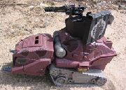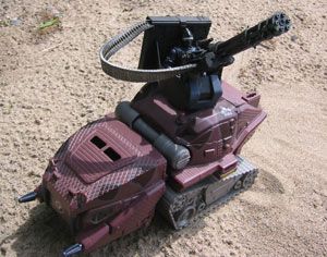 Among the complaints about the HISS IV was one that really irked me, it's poor armament. I could deal with the stupid head/cockpit gimmick and the useless troop compartment at the rear but this thing was woefully under armed. At first I tried to justify it by turning it into a mobile strategy center (I added some antennas and sensors using the extra sound attack slots), then considered finding or getting casts made of the NAC's weapons to beef it up. Then it happened, was browsing through a K-Mart on the verge of closure and found the multi-barreled wonder you see. In fitting the ammo box and weapon to the turret I also took the opporotunity to add some extra protection for the gunner. It's not quite perfected, but it has served to make the HISS IV something I use rather than laugh at.
