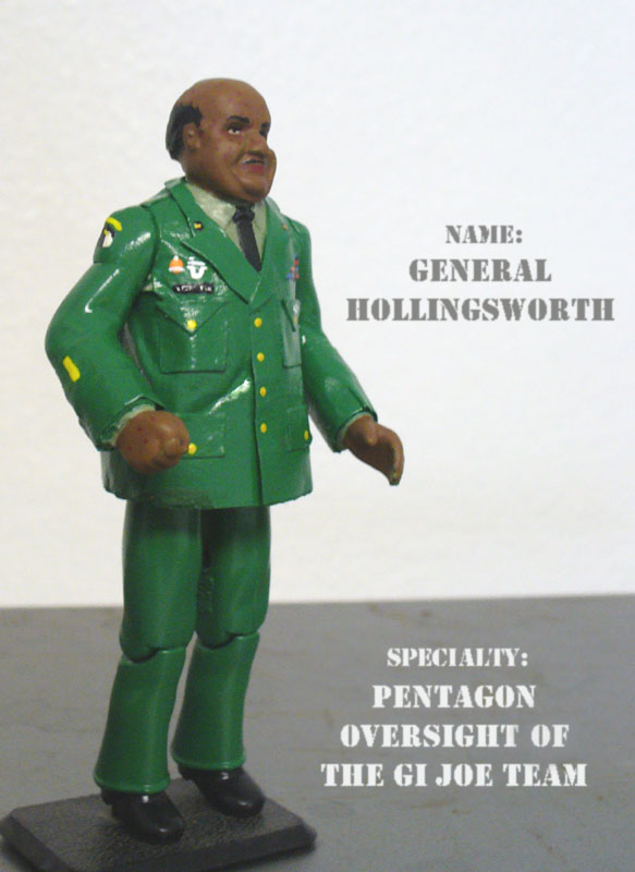 This figure began as General Austin- a character of which I'm astounded no one has bothered to make a custom. When I went back to GI Joe #1 for reference material, I was surprised to learn that the character wasn't as pudgy as I had remembered. Then I remembered that General Hollingsworth, Austin's semi-successor, was drawn a bit heavier. It also occurred to me that changing the skin tone would make the figure less recognizable as having a Boss Hogg head, and so one general became another.