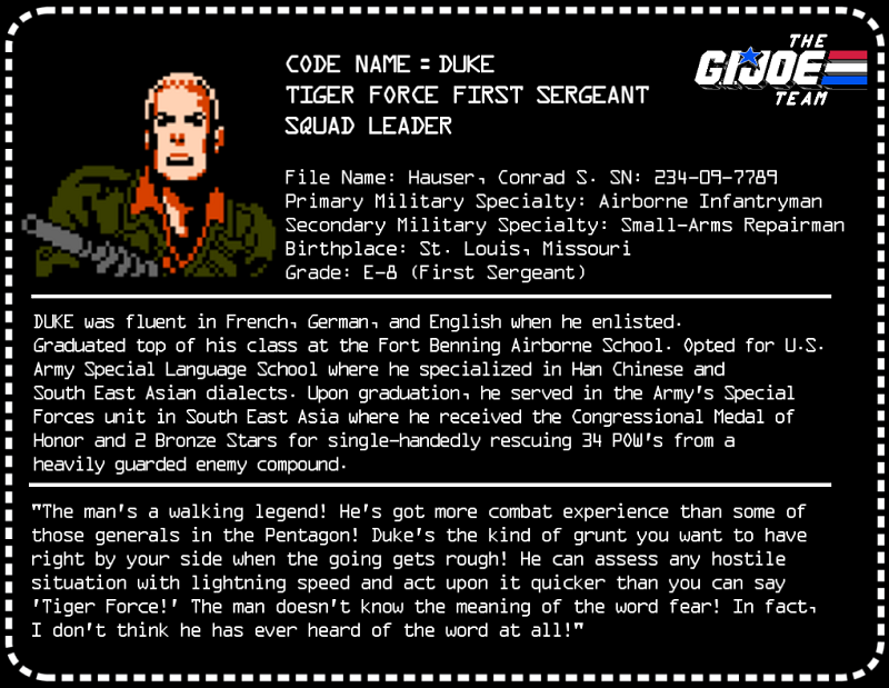 Duke's original art was the cleanest of the bunch, and this figure (minus the pink skin) turned out more normal than any of the others.