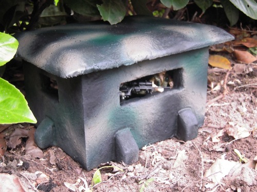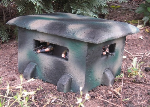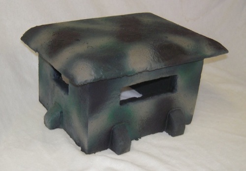 The Forest Bunker was made within a personal record breaking time of 6 hours. Styrofoam is very easy to work with and very customizer friendly. I cut out all the shapes and sanded every piece to make it suitable for the spray paint. All the pieces were glued together using hot glue and some toothpicks for extra strenght. After that, I covered the whole bunker with a mixture of sand and PVC glue to get the rough texture, a more concrete-like look. Finally I sprayed the Forest Bunker with three different paints.