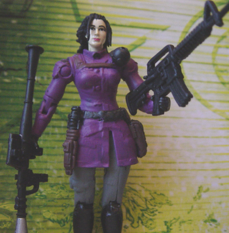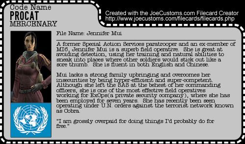 I really the game mercenaries and when this GP came up, I could come up with no other idea that I liked better. Jennifer Mui is the light footed, posh killer of the group. This is my first real effort in green stuff and sanding and unfortunately, I put my painting off a little longer than I should have and some of the issues with sanding I had, I did not notice until after paint. Overall, I am still very pleased with her. Pictures 1 and 2 are front and back, respectively, picture 3 shows the removable grenade from her harness. Picture four is her equipment which is pretty much a cut down version of stock weapons. The M16 is one of my fave conversions, it is from the AA slice I believe, with the underslung shotgun cut off. I like the overall size, but hated the shotgun. Picture 5 is the required reference photo, which has been my main inspiration. I chose to do her bio in filecard form because its something I really enjoy about this site and hope to do it with all my future customs. The final picture(7) is the WIP of the sungri scout, a vehicle in the game. I had intended to enter it as well, but after some slight mods to the body, I really could not complete the conversion by painting it up. Its a nice vehicle though and it will be completed.
