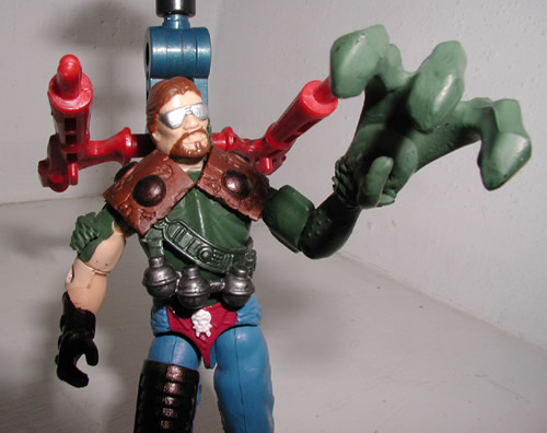 When I started, I knew I wanted to make Monkeywrench a hybrid alien-type. I dug out my parts box and quickly found Monkeywrench pieces and then the remains of the old Micronauts figure, Repto. I combined the two, quickly deciding what to do with the foot, etc. I scrounged around until I found a right leg and arm that I liked, so I now had a base figure. I added the Xevoz hand and put it all together. I liked the look, but there was still plenty missing. I had to trim the neck joint to fit, and cut off the foot. I knew I needed grenades, and those were easy, but the torso still didn't look right. He needed shoulder pads. I found what I was looking for with a MageKnight figure. I was working on a Heroscape custom at the same time, and found inspiration in some of the parts lying around from that, including the thumb-claw, and the scaly pieces that I added to the head and right shoulder. The paint job was mostly pretty easy, though I had to mix the green for the skin and the blue for the jeans. He really needs some kind of targeting scope or something added to his head, but I ran out of time. Overall, it was lots of fun and I wouldn't mind a whole set to go with him!