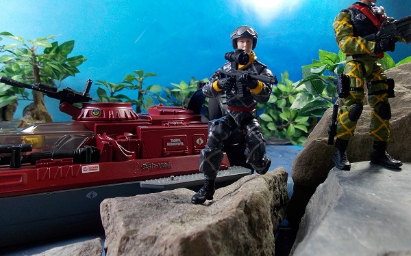 As they approach the northern shore of the river, two South American Cobra agents, Trigger and Lightning, specially outfitted with state-of-art Python camouflaged uniforms, patrol the river in the Cobra Water Moccasin.