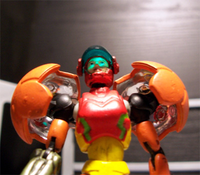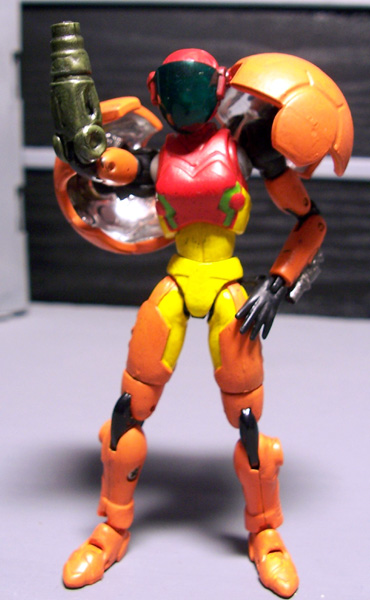 Samus was quite easy to conceptualize - as soon as I saw those Microman parts, the recepie just assembled itself. I originally wanted to have a removable helmet, but to keep her armoured look proportional I just went with the sculpted over the Jinx head. I went with the more traditional Super Metroid flat colours than the more recent metallic scheme. I also wanted playability so I swapped out the joints for already black ones so I didn't have to worry about paint chipping. The fact that the shoulder pads can detach to become the morph ball is an added bonus. I used an of effects which don't really show up in the photos - filling the plugs with white glue after painting, and since it dries clear it gives a reflective 'light tube' effect. Overall I'm very pleased with how she turned out.