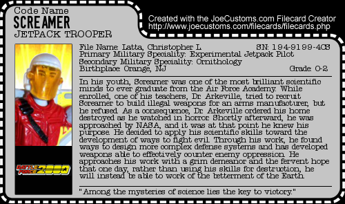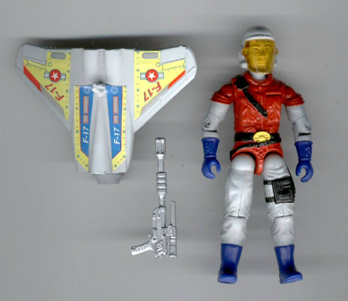 HEAD: Snowstorm 93 ARMS: Crystal Ball 87 TORSO: Cross Country 86 WAIST: Red Dog 87 THIGHS: Dial Tone 94 FEET: Dial Tone 94 JETPACK: Metal-Head 94 missile launcher (modified w/ plastic F-15 wings & stickers) GUN: Skycreeper 91 (cast by Sidewinder)