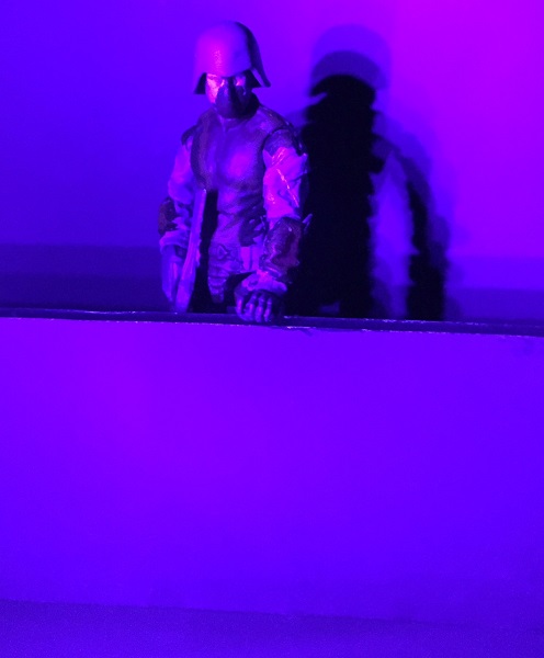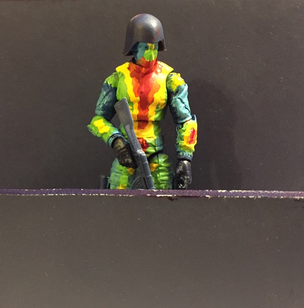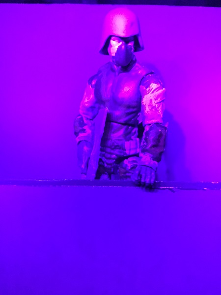 They say that "the night belongs to Low Light". And that's the entire basis for this custom - what a Cobra Trooper looks like through Low Light's big ass night vision scope, or as a thermal image. I crafted a quick and easy back drop for him out of blue foam core. Unfortunately, my good lighting photo area is currently unavailable to me, so the lighting his kind of off in the pics. Pluv did a little photo manipulation on one of the pictures to heighten the effect, which I dig.