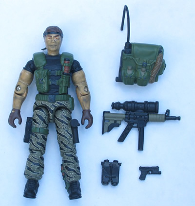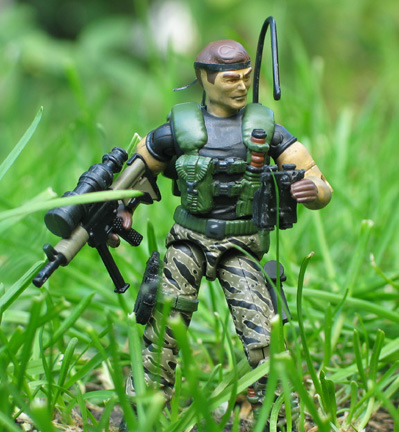 I based the uniform design on various pictures I had seen of Vietnam-era recon troopers. I pieced the webgear on the chest together from pieces of Elite Force and JvsC belts. I also wanted him to have a flashlight for night operations, but I didn't want to use the Outback thigh (anyone who's seen a few of my customs knows I love that part, and I've used it a few too many times already), so I hollowed out a space on the thigh and used a Tunnel-Rat flashlight. I also had to sand down the insides of the arms near the shoulder to allow them to rest more naturally at his sides (those Duke arms stick way out if you don't alter them).