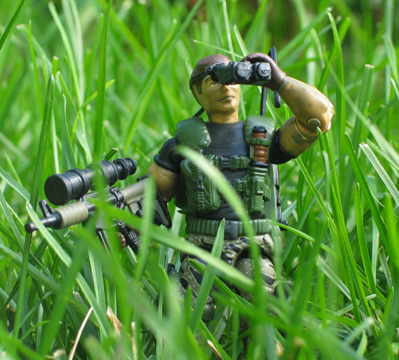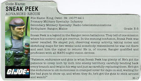 I envisioned Sneak-Peek as the filecard described him: crawling into enemy territory, digging in under cover, and trying not to let his presence be known. It's a pretty risky specialty, and it would take a tough soldier to go through with it. So, I tried to toughen Sneak-Peek up a little.