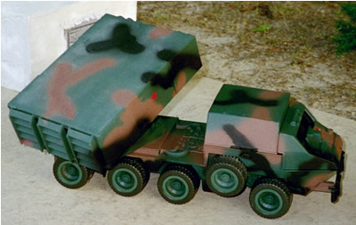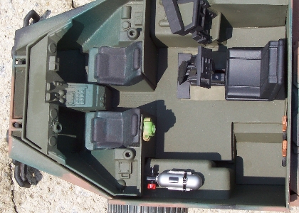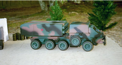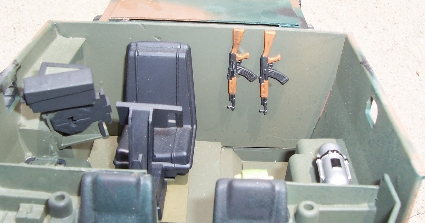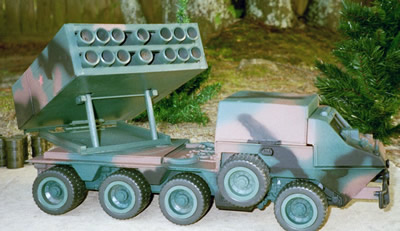 I used parts from 2 APCs for the hull and cab of the vehicle. The launcher box was scratch built from plastic for sale signs. The elevation hydraulics are dowel rods with coat hanger wire hinges. The body and launcher box were reinforced with styrene (Plastruct ) strips. The launcher vents are Plastruct 1/24 scale staircase. Other details include parts from various Star Wars toys for the hydraulic system and a brush guard from The Corps! HMMW-V. Interior details include a steering wheel from The Corps! Truck, a gunners station from the Robotix Toy line, a first aid kit and fire extinguisher from the Soldier force line, and personal weapons from 21st Century Toys Vietnam series, and a backpack from Power Team Elite. The decals are From CAM.