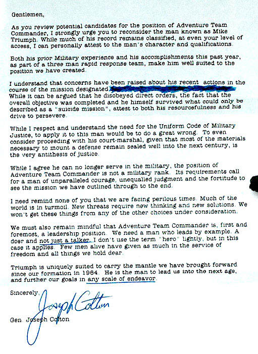 Adventure Team Commander: Alias Mike Triumph. Call Sign: Trouble Shooter AoE: Command, tactical operations, logistics, intelligence gathering, electronic surveillance and small arms. Was part of the leader of the '69 "Adventures of" team. He put together the Adventure Team.