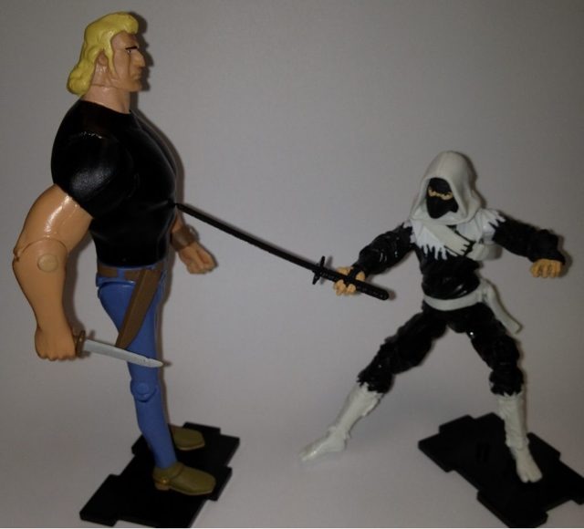 Sculpt wise, it is a perfect 3D version of the charcter. The head is dead on, the communicator watch looks great, and even his boots have detail on them. The hands are sculpted in a gripping pose that hold thenknife tightly, but the thumbs are attached to the index finger. So no gun pointing will be possible.