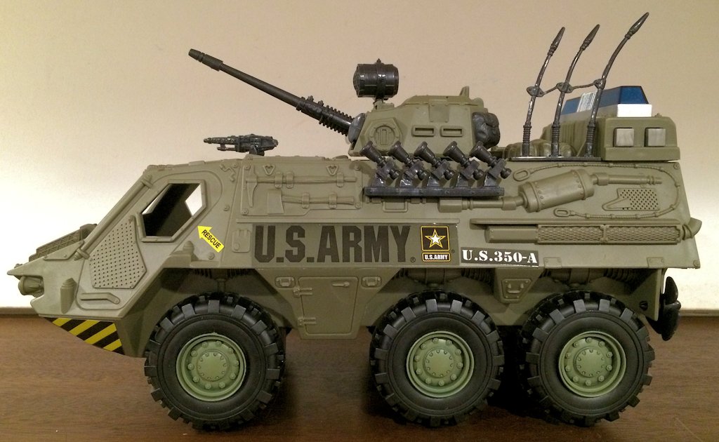 This APC was first released in the US around 2003 or so and looks a lot like an M93 Fox APC. It was available in the Police Force line in blue and also the Soldier Force line in a brown/silver color (that was pretty ugly.) Most US releases I saw had no light/sound effects.