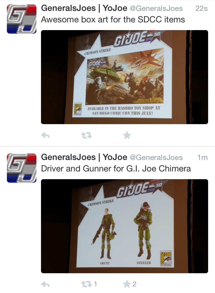 Interesting. I like what they've done with the Snow Cat and the AWE Striker, and I'm definitely interested. Most of the figures sound cool enough, and I do get a kick out of the Storm Shadow/Spirit set, and I'm pleased they're doing a Crimson Shadow Guard. The SDCC set is very interesting, with a Crimson SkyStriker and a G.I. Joe HISS, but I know what the price tag and availability of something like that is going to be, so I'm not even going to consider that right now. But -- I'm impressed with the concept.