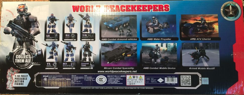 Just when I thought I was done collecting 3-3/4 figures and vehicles after 40 years, something comes out that looks cool enough to suck me back in. I have a few vehicles from PTE/World Peacekeepers, but when I saw this on the board earlier this year I started checking eBay for it. I am not sure that these Robotech/Ghost in the Shell -looking powered armor figures will make it into Big Lots, so I have volunteered to be the 'cooler' for all of you.