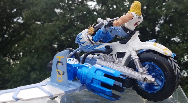 I always intended for the bike to dock to a wing system but really didn't think it through. Sorting through some stuff I came across a CORPS glider that was a knockoff of the Cobra Glider. The Gun popped off and it made a great deck for the bike. Mixed up some Apoxie and pressed the bike into it to made a tight mold to lock the bike into place. The wings came from, of all things, a flying motorcycle line that I picked up from TRU on clearance many years ago. Been trying to use them forever and finally found a place they seemed to fit naturally. The jet engine are the arms from a dollar tree robot with the hands replaced with the shoulder mounted missiles of the same robot. Finished them off with wheels from Swampmasher. Detail of the fuel tanks are BTR and two hoses fdrom a HEAT Viper for the control connectors completed it.
