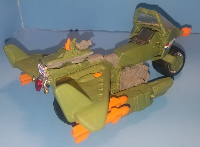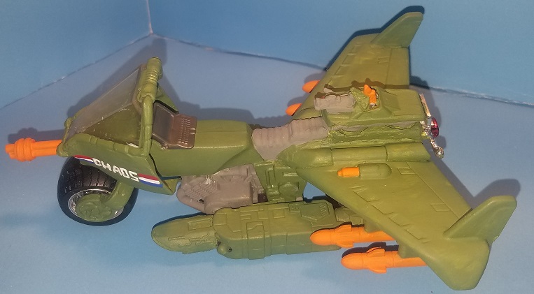 Obviously based on their dad's HAVOC, the Blais brother, Havok and Hayseed gave the bike a lower and more steady stance with the small diameter, wide tires. The wheel base was stretched to add to on road stability. Folding wings were added so the bike is technically street legal. All weapons are merely cosmetic except for the "missiles" are for extra boost when needed. The main thrust is provided by the dual rocket engines mounted low on the sides of the gasoline engine. The gasoline engine propels the CHAOS when riding on ground and helps get the bike up to launch speeds faster than just using the rocket engines and boosters. The small drone is controlled by the one man pit crew of Hayseed and gives Havok a birds eye preview of the track on the console mounted to the dash of the CHAOS. Where many RAMJETs are based on speed, the brothers planned the CHAOS to be durable and with the added drone assistance, Havok can pilot the machine expertly and quickly with no sudden surprises.