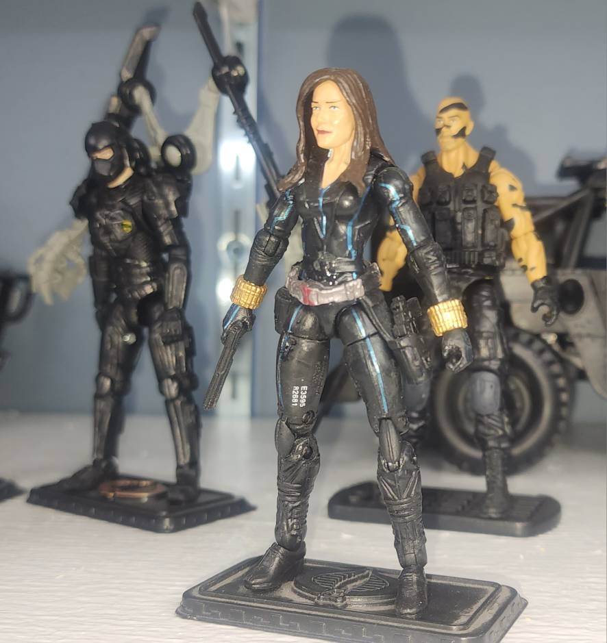 Her savior, Widow, and in the background is Vulcan and Benchpress. Vulcan is the test bed for the Centurion armor system using the stolen designs of SkyLab. Benchpress originally joined GI Joe but could not pass the Greenshirt program.