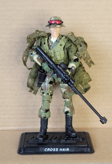 I realize Snake Eyes is one of the most overexposed characters on the roster and a bit of a Mary Sue when it comes to resolving any issue that doesn't require talking, but as a kid I wanted him on every mission. The Rise of Cobra line released a desert version that I thought was a little more than half bad, so I Retro-fitted that for this mission. Now that he has the same upper legs as my O-13 Retro Snake Eyes and the same lowers as my Retro Duke, he's the right height. I also replaced the torso with one from a Renegades Snake Eyes (looked more natural) and gave him the hands from a Pursuit of Cobra Firefly. Modified the bandolier to better hold my default Snake Eyes scimitar from Marauder and that's where the micro-uzi in his thigh holster and the silencer on his Rise of Cobra SMG came from as well. The knives and hip sheaths are from a Retaliation Joe Trooper.
