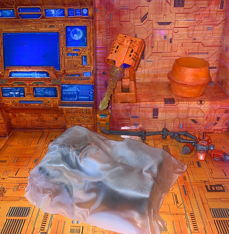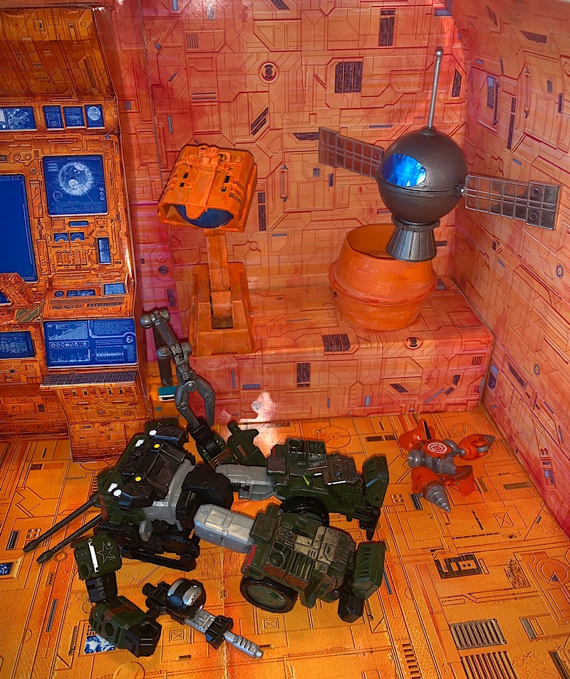 This is the last thing. Two tiny details I want to point out. 1) There is a picture of the probe scanned VAMP displayed on the Teletraan-1 main screen. It is an inverted color of the VAMP v1 blueprints. 2) The kid put one of her Bot Bots in the diorama because it matched the colors. When I saw that and the fact its alt mode was tape, I decided to use it as the housing for the claw that puts the transformers back together.