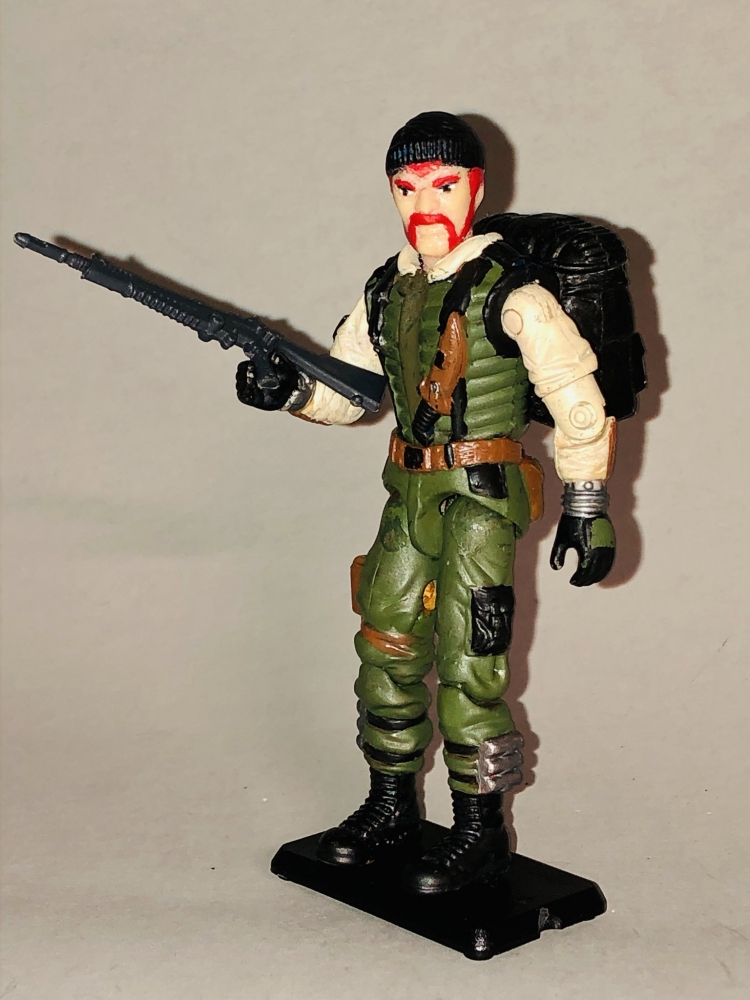 Anyways, I had a cast snake eyes goggled head from somewhere in a fodder box, and actually made a snake eyes custom out of the figure. Wasn’t my intention but it was an easy dremel job, with some small paint apps. I do believe the gear is Raginspoon. I added a mtf holster, and a clip to hold the silencer onto the backpack.