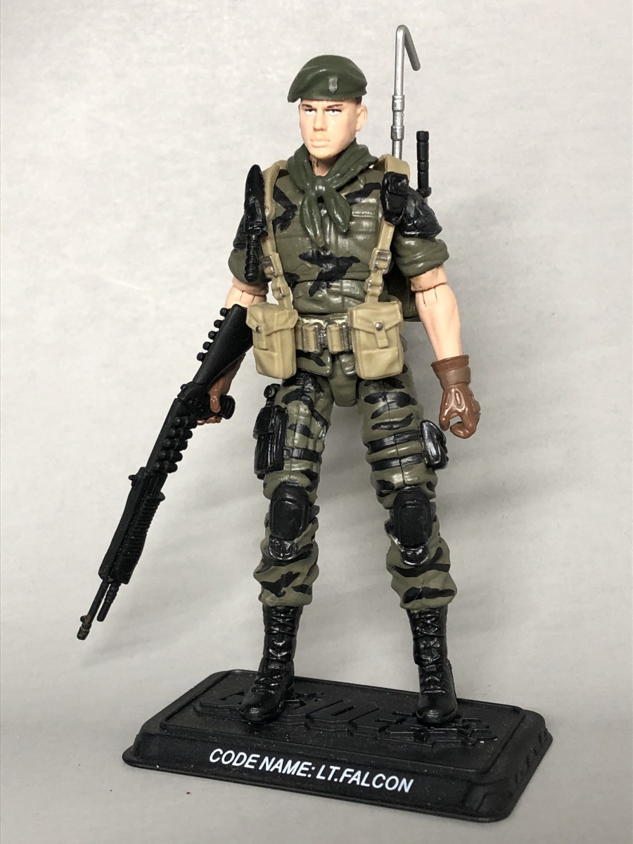 Falcon. I chose the Tatum head for the youthful appearance. It never dawned on me until I made Recondo last spring that instead of eyeballing camo patterns and not being happy with it, I should just mimic the ARAH figures pattern. So I copied the ARAH Falcon as much as I could, and scavenged some parts off my old Falcon custom as well. The camo Should have been a no brainer in the last 20 years of doing this, but it never crossed my mind.