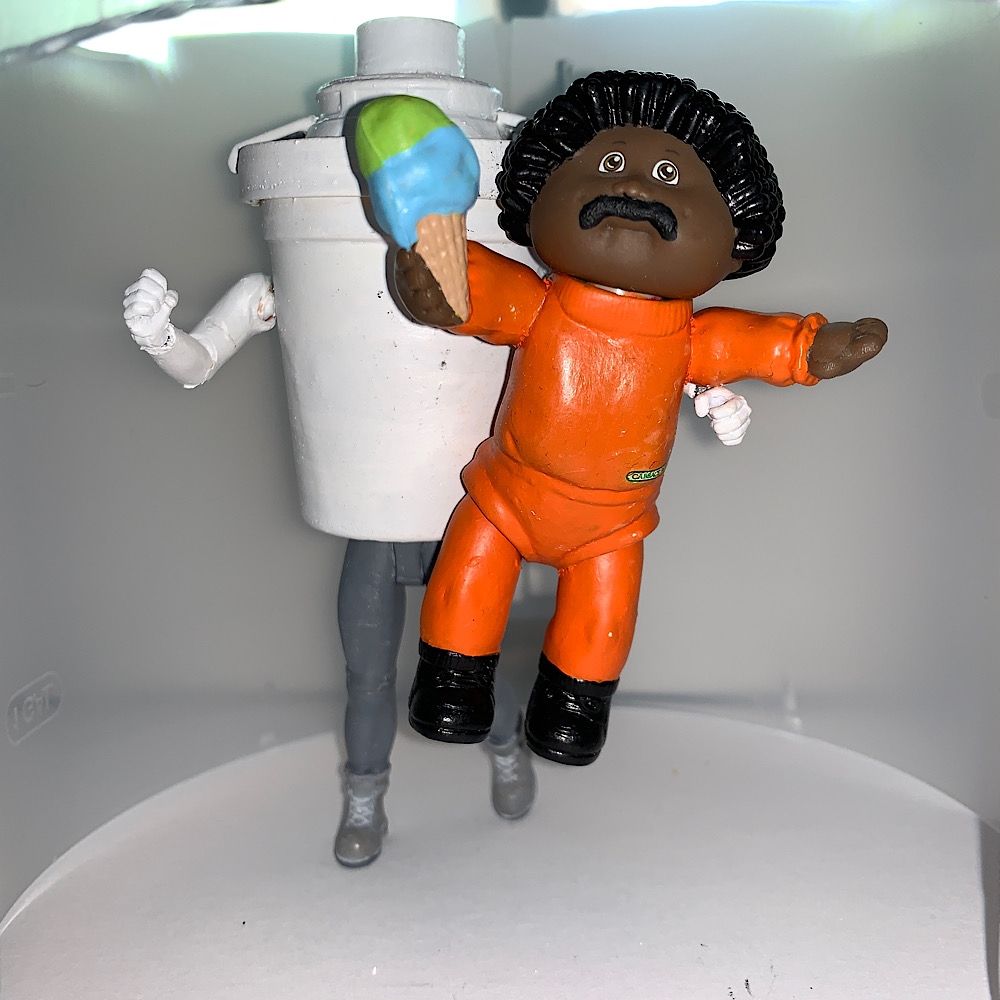 I’ve had the enlarged ice cream maker pieced together in a baggie, but was having trouble figuring out the Willrow Hood part of it. Megaconstructs? Galoob Action Fleet? Fortnite Battle Royale? Imaginext? Lego? World’s Smallest GI Joe? Maybe something from HeroForge? Lots of contenders but nothing that wowed me. Nothing was as cute or outside the box as the costume itself. As with most things, the answer came while I was looking for something else, the little Cabbage Patch kid holding an ice cream. Even if you don’t know what the custom is, you know what the custom is. The flavors are based on the Bubo Wamba Family Farms Bantha milk from Disney’s Batuu milk stand in Galaxy’s Edge.