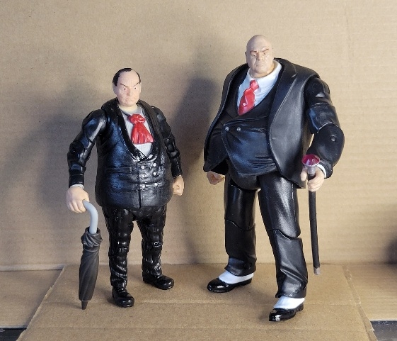 My first attempt was inspired by his appearance on Netflix's Daredevil and built using a combination of 6-inch Penguin figures, a ToyBiz Professor X head and some Legends Namor hands. I was proud of the engineering involved, but ultimately he didn't fit the aesthetic of my other MCU customs. My second also used a six-inch Penguin coat/arms and a Big Boss waist/legs from C.O.P.S. with some WWE figure hands, boots and head. He was fine for a comic version but way to big to hang with my MCU-inspired customs. And my third was just too small (but makes a pretty decent Penguin, I think).