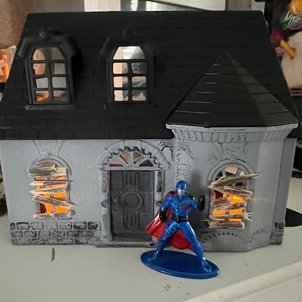 My wife mentioned seeing a haunted house decoration on tiktok that the lady used a Dollar Tree dollhouse for. We found the doll house and I sprayed painted it. But then she wasn’t sure if she wanted it inside or in our herb garden by the front door. So I know it lacks details. But what I did want to show her was how cool it looked with tea lights…and a fiber optic. What I wanted to show you guys is it is Jada scaled!
