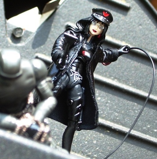 It isn't really that complex, but I'm pleased with it. Essentially its a bunch of pieces from my old Baroness custom schlepped and dremeled onto the new one, with added paint apps and accessories. The hair was short for her head, so I sculpted the short front bangs out of green stuff. Her hips were kinda wonky, so I shaved the inside seam down so that she could pose with her legs close together, and pull her legs out in front more. I don't know how well that came out in the picies. Then I just added some selective glossing and was ready to go ^_^ I didn't go for anything super-complex in the paint, 'cause I wanted her to fit in with the other 25th figures. Maybe someday I'll do an Ultimate Baroness with 25th parts. The coat is from the fantastic Killuminati, of course.