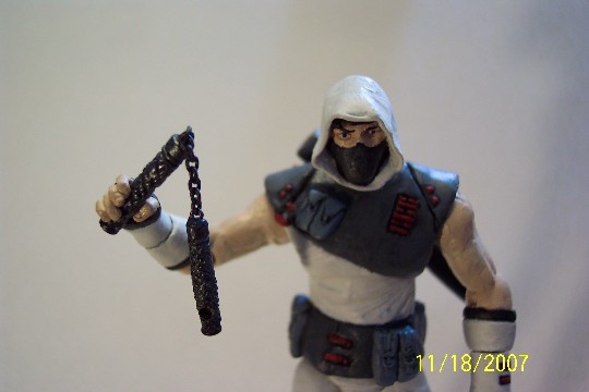 I first sanded the sleeves off his arms along with the detailing on his shirt. Then I sculpted his chest piece, gauntlets, belt, knee pads, leggings and shoes. I also sulpted his biceps, but I'm not really happy the way they turned out. Lastly, I painted him as close to the comic as I could. The sword and sheath were cut from his backpack and pegged to his back. I'm also constructing a pair of nunchucks that attach to his belt. I still have some touchup to do on the painting.